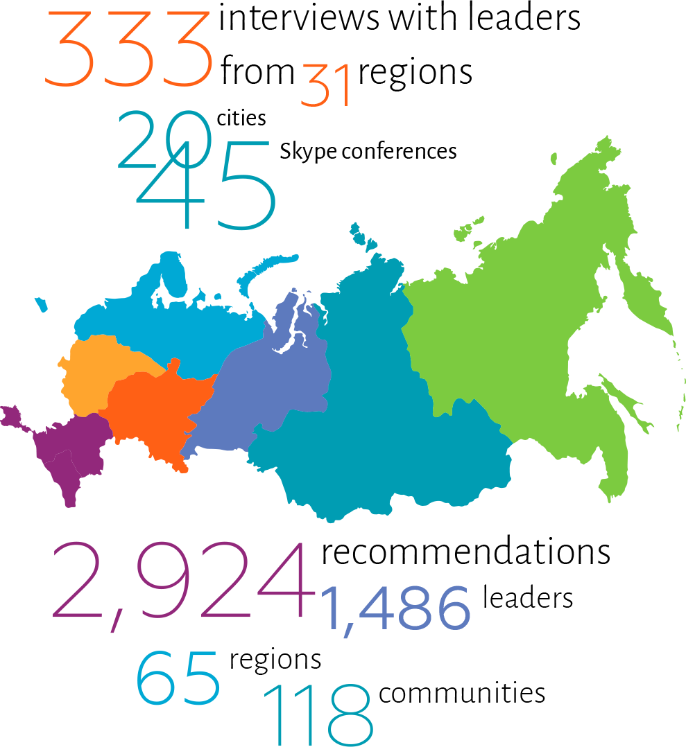 304 interviews were held, with over 1,800 recommendations received, 963 leaders identified. The fact that there are so many outstanding projects was a revelation even for the community (source: numerous reviews).
